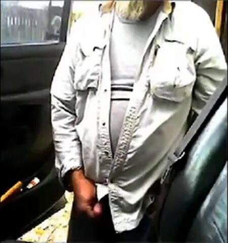 Bearded daddy strokes his cock by his truck outdoors.