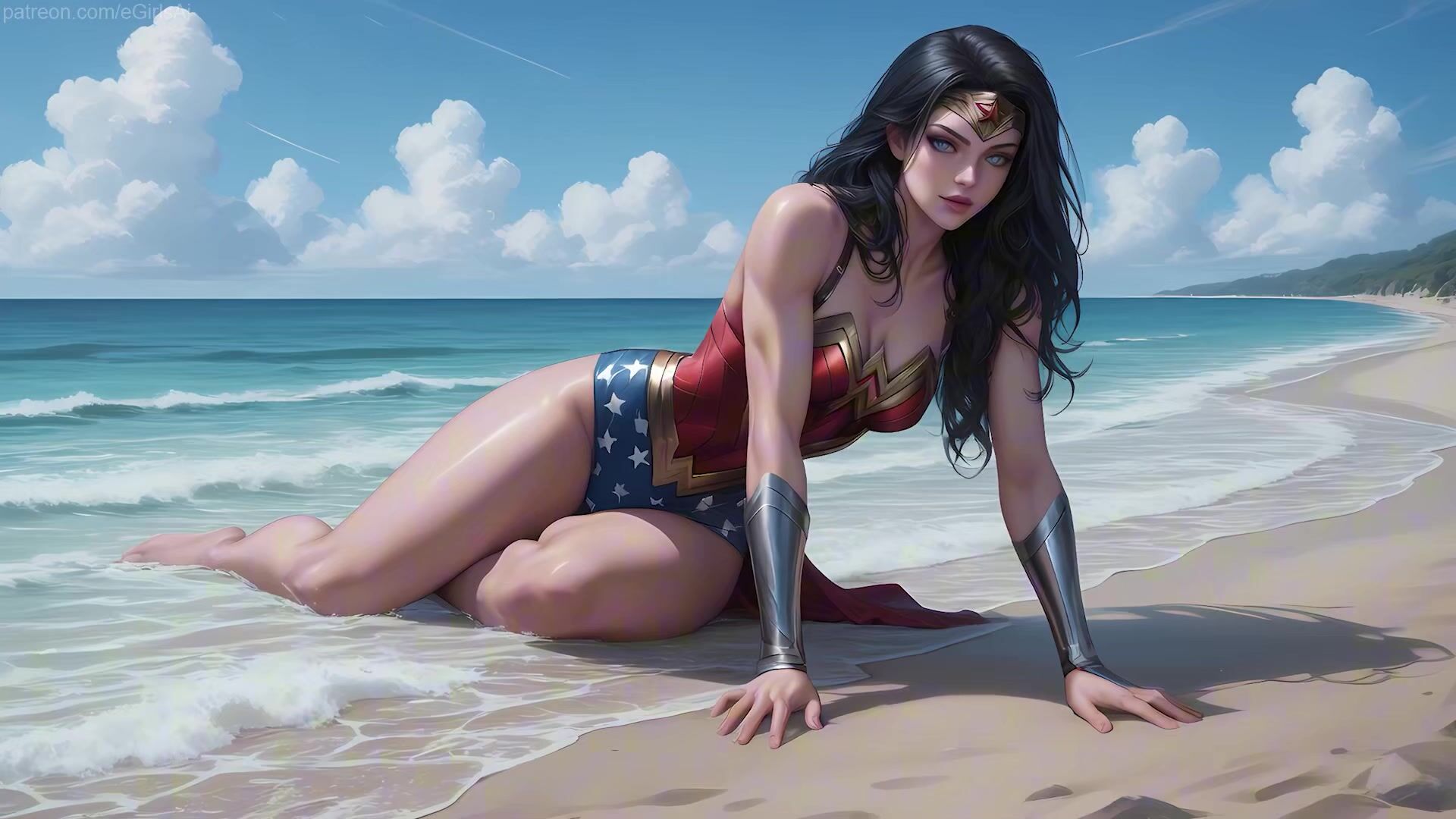 Cartoon Wonder Woman and her Nth boyfriend make love and have sex on the beach